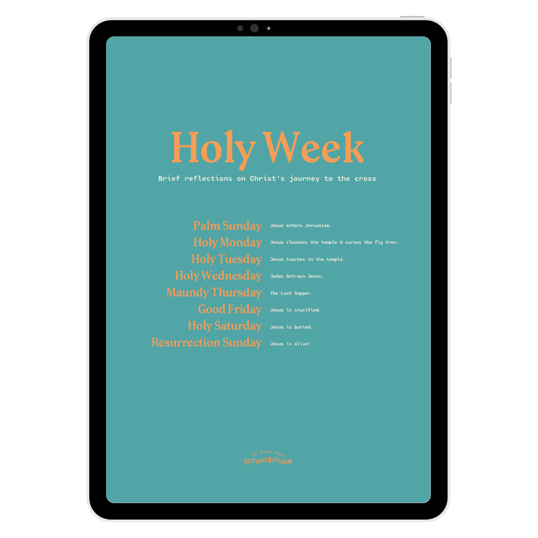 Journey to the cross with me! This download offers you a Scripture reading and reflection for each day of Holy Week (Palm Sunday through Resurrection Sunday).
